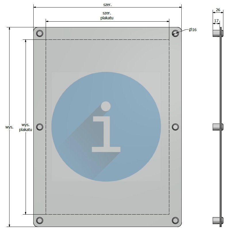 Antyrama na plakat z plexi. Idealny produkt do większych wydruków i plakatów. Wykonana jest z plexi bezbarwnej, która gwarantuje doskonałą przezroczystość. Antyramę mocujemy na sześciu aluminiowych dystansach. Antyrama ma minimalistyczny wygląd, który pasuje do większości pomieszczeń.