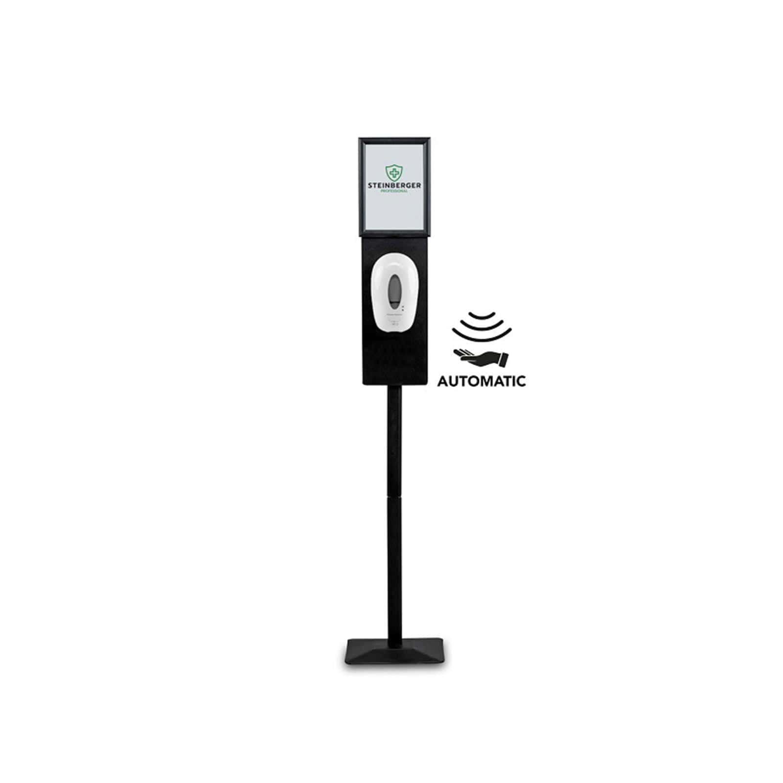 Bezdotykowa stacja do dezynfekcji rąk znajduje się na stabilnym, metalowym, czarnym stojaku. Sposób dozowania płynu bez obowiązku dotykania urządzenia jest bardzo higieniczny i zapewnia dodatkową ochronę. Co należy zrobić? Wystarczy wsunąć dłonie pod automat dozujący, a odpowiednia porcja płynu zostanie rozpylona w formie spray’u. Co ważne, możemy ustawić ilość aplikowanego płynu.