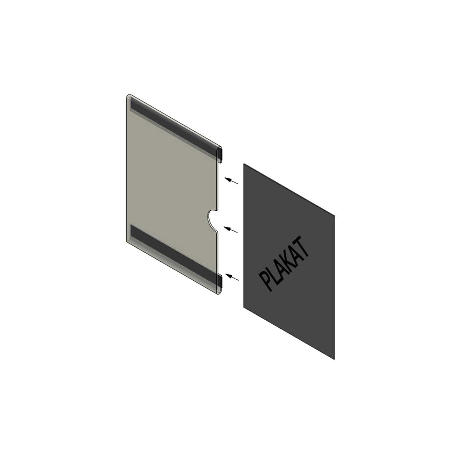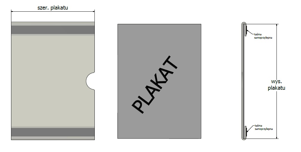 Kieszeń plakatowa typu „C” wykonana jest z tworzywa PET (wysokiej jakości polimer) o grubości 1,5 mm. Wyposażona jest w mocną taśmę samoprzylepną, umieszczoną na dwóch zagięciach kieszeni, dolnym i górnym. Taśma umożliwia przyklejenie kieszeni do wszystkich gładkich powierzchni, takich jak szkło, plastik, metal, drewno. Plakat widoczny jest z jednej strony. Kieszeń mocujemy w pionie lub poziomie. Plakat wsuwamy w szczelinę powstałą w zagięciach kieszeni. Formatka z PET doskonale chroni przed zabrudzeniem, kurzem i wilgocią.