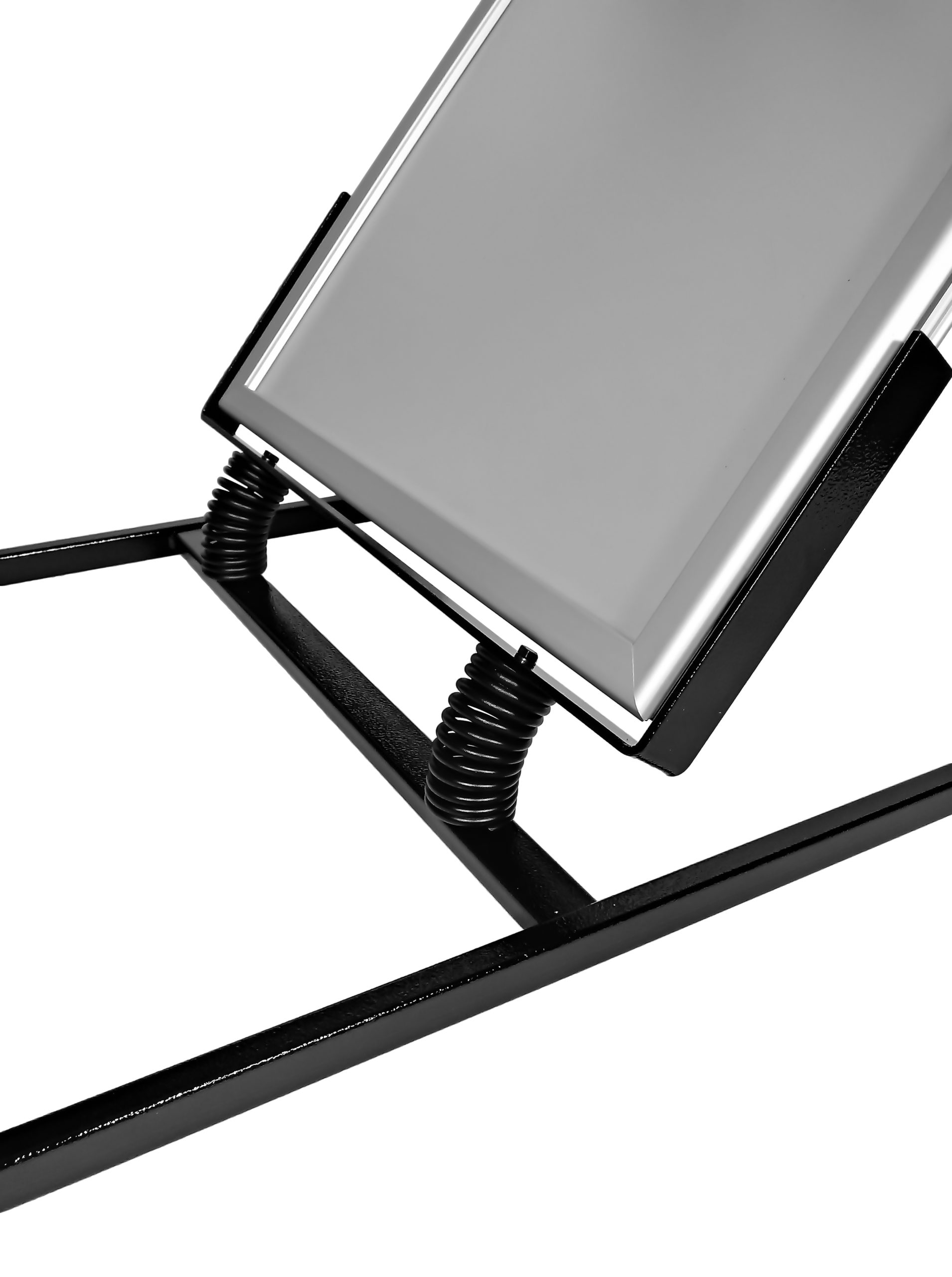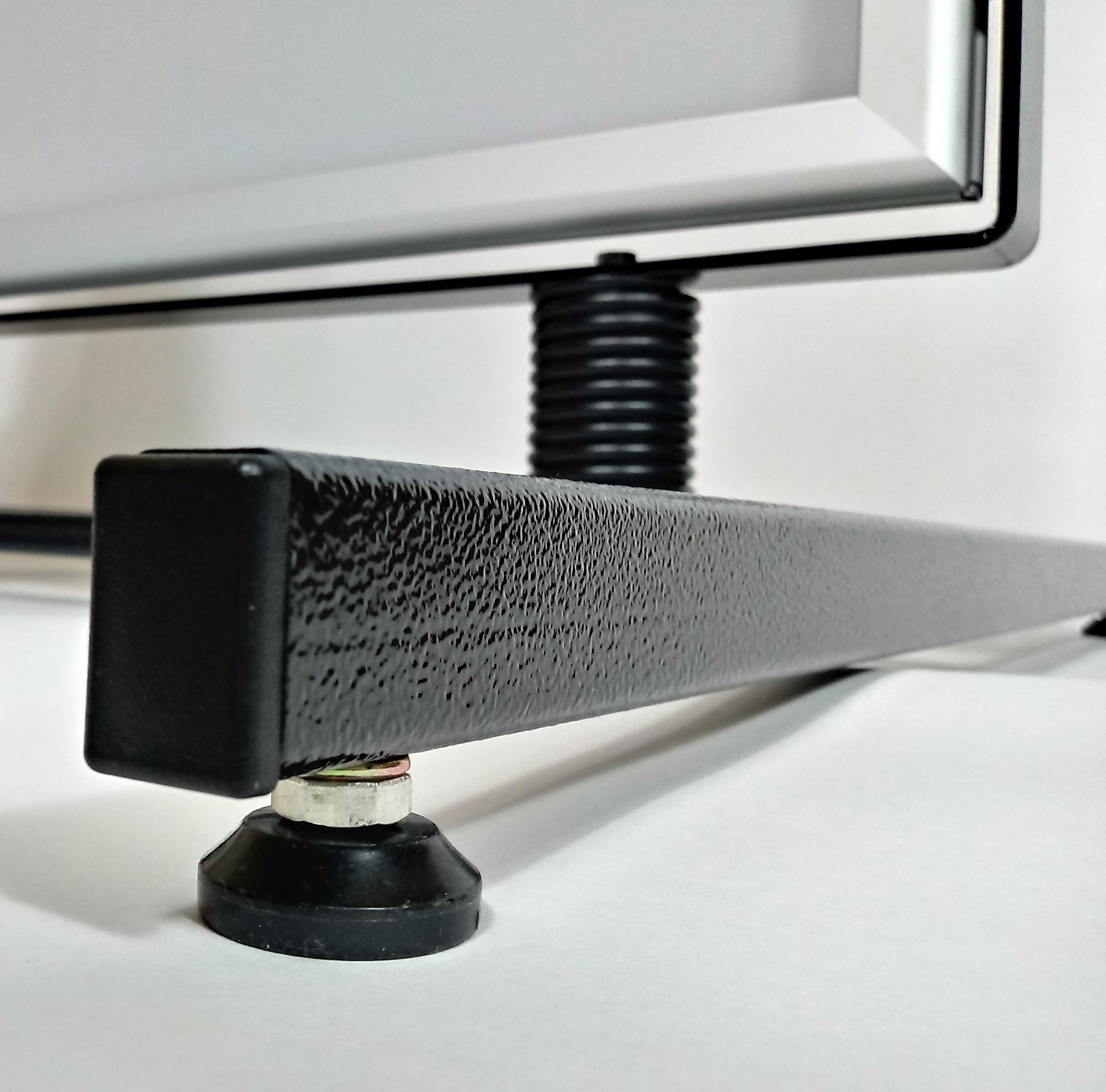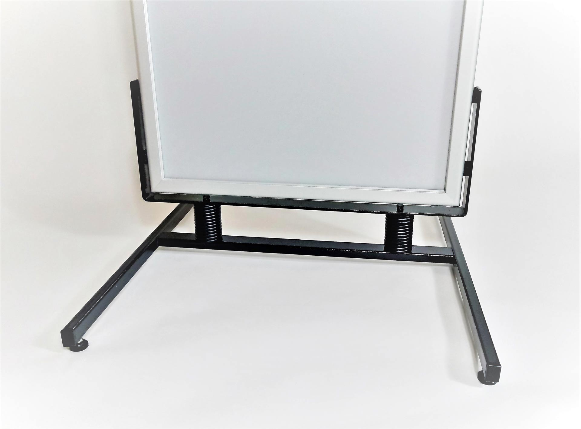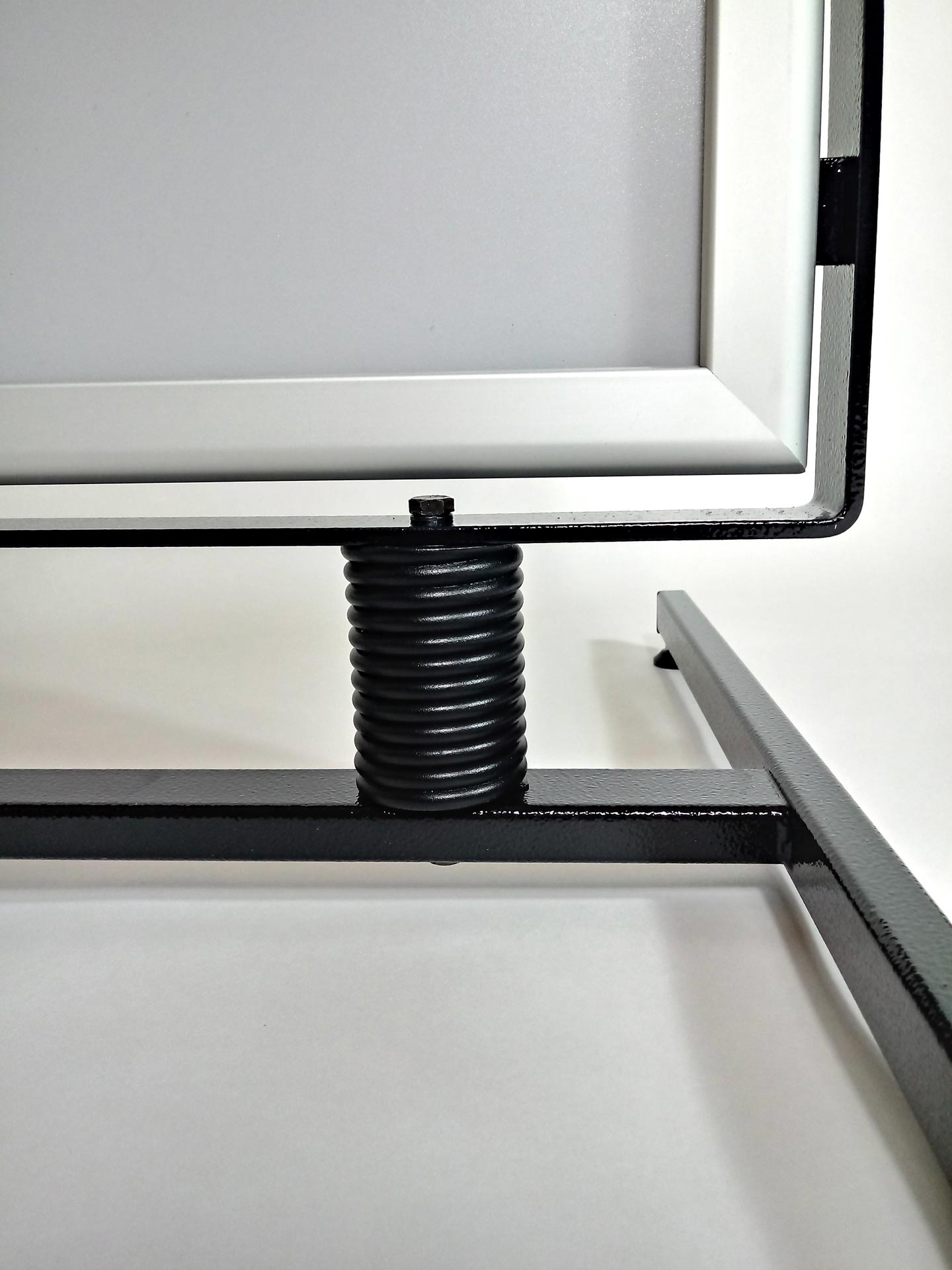 Sprężyny wykonane są z wysokogatunkowej stali sprężynowej, ocynkowanej i pomalowanej proszkowo w kolorze czarnym. Sprężyny te umożliwiają bezproblemowy ruch wahadłowy tablic w czasie silnego wiatru. Stalowa podstawa jest wyposażona w stopki o regulowanej wysokości, które pomagają wypoziomować stojak. Potykacze te są dostępne w dwóch formatach, dostosowanych do ekspozycji plakatów A1 (594×841 mm) bądź B1 (700 x1000 mm). Dzięki użyciu tablic zatrzaskowych wymiana plakatów jest bezproblemowa. Aby zwiększyć wodoszczelność możemy umieścić w tablicach dodatkowe uszczelki gumowe. Waga potykacza na sprężynach wynosi ok. 20 kg. Produkt ten świetnie sprawdza się jako zewnętrzny potykacz reklamowy.