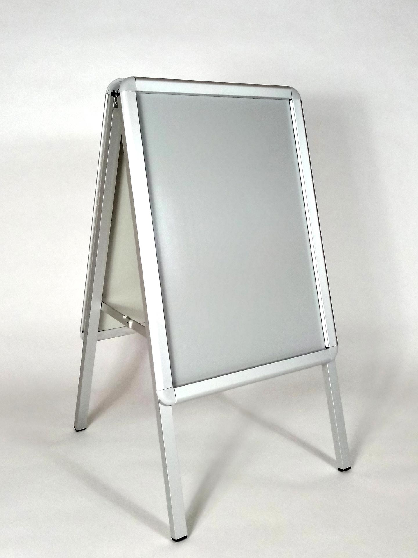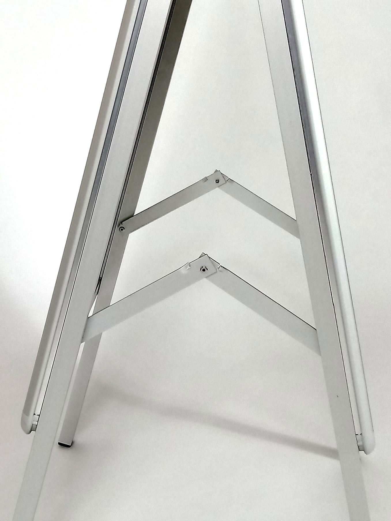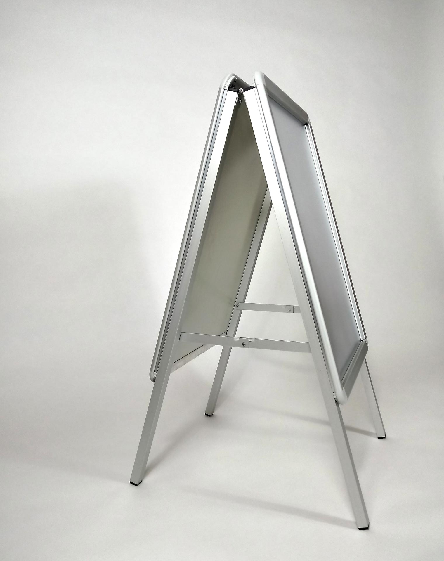 Dodatkowo, w związku dodaniem blachy, zwiększa się waga takiego potykacza przez co staje się bardziej stabilny. Nogi w stojaku typu „A” (inna nazwa potykacza) wykonane są z rury aluminiowej prostokątnej. Na końcach nóg znajdują się czarne zaślepki, które stabilizują stojak. Potykacz ten możemy używać zarówno wewnątrz pomieszczeń, jak i na zewnątrz. Pamiętać musimy jednak, że potykacz ten nie jest wodoszczelny. Przy mocniejszym deszczu istnieje ryzyko, iż poster który w nim umieścimy – szczególnie w jego dolnej części – będzie lekko mokry. Mając to na uwadze, sugerujemy wydruk plakatów reklamowych na specjalnych materiałach, nośnikach wodoodpornych. Jeszcze innym sposobem chroniącym plakat przed zamoczeniem może być uzbrojenie tablicy w gumową uszczelkę, która zminimalizuje ryzyko dostania się wody do wewnątrz.