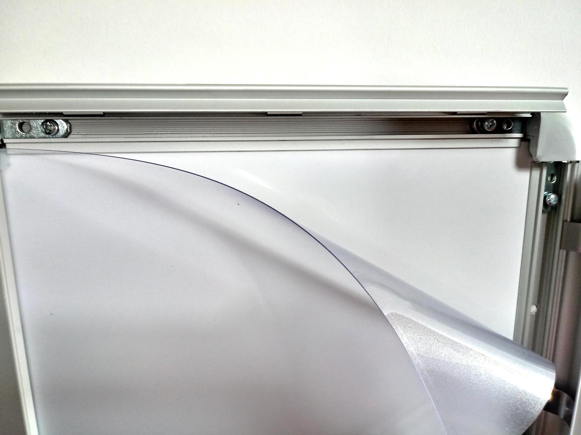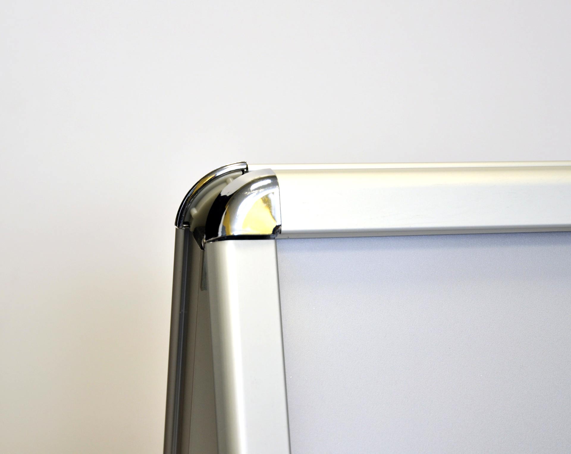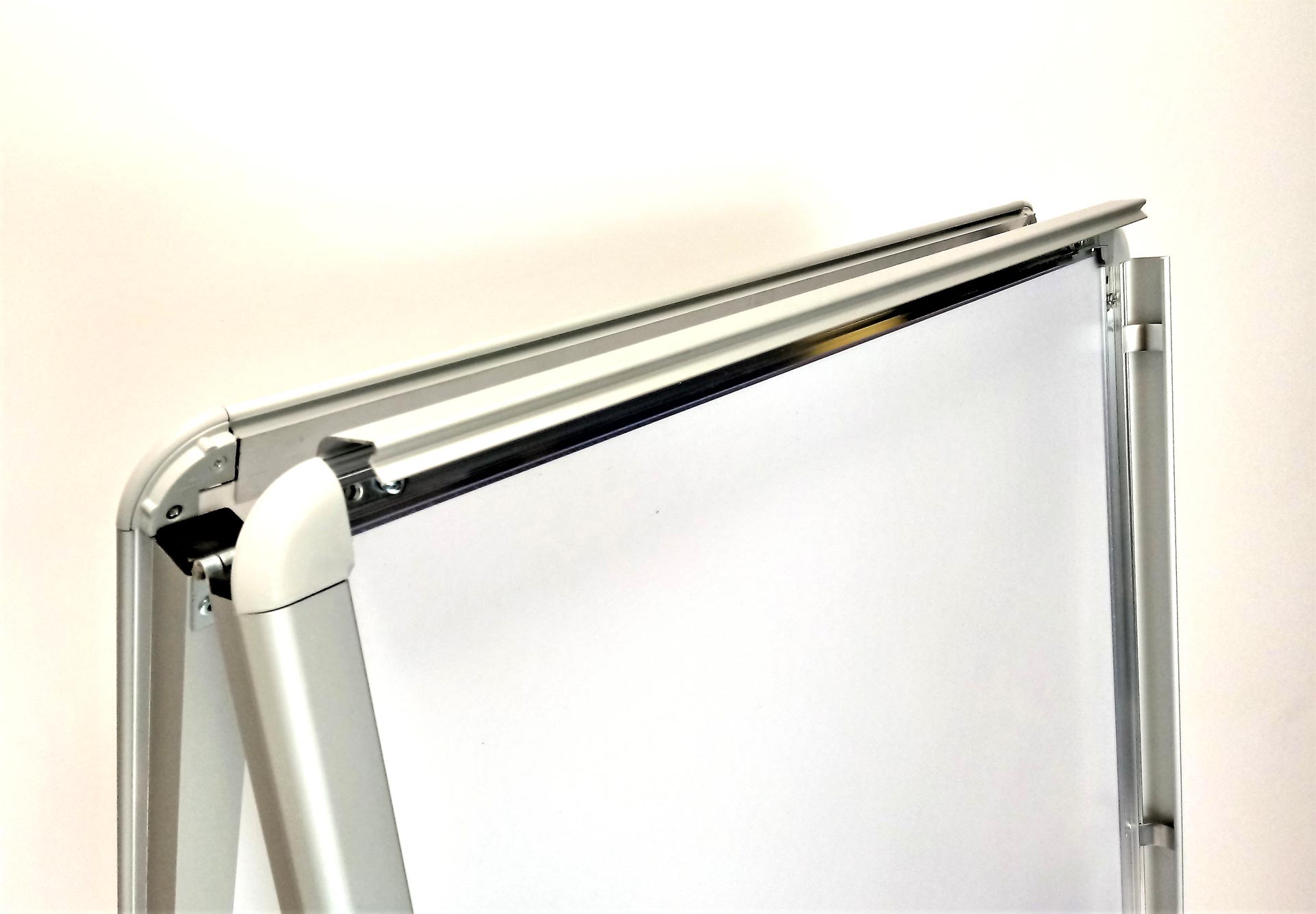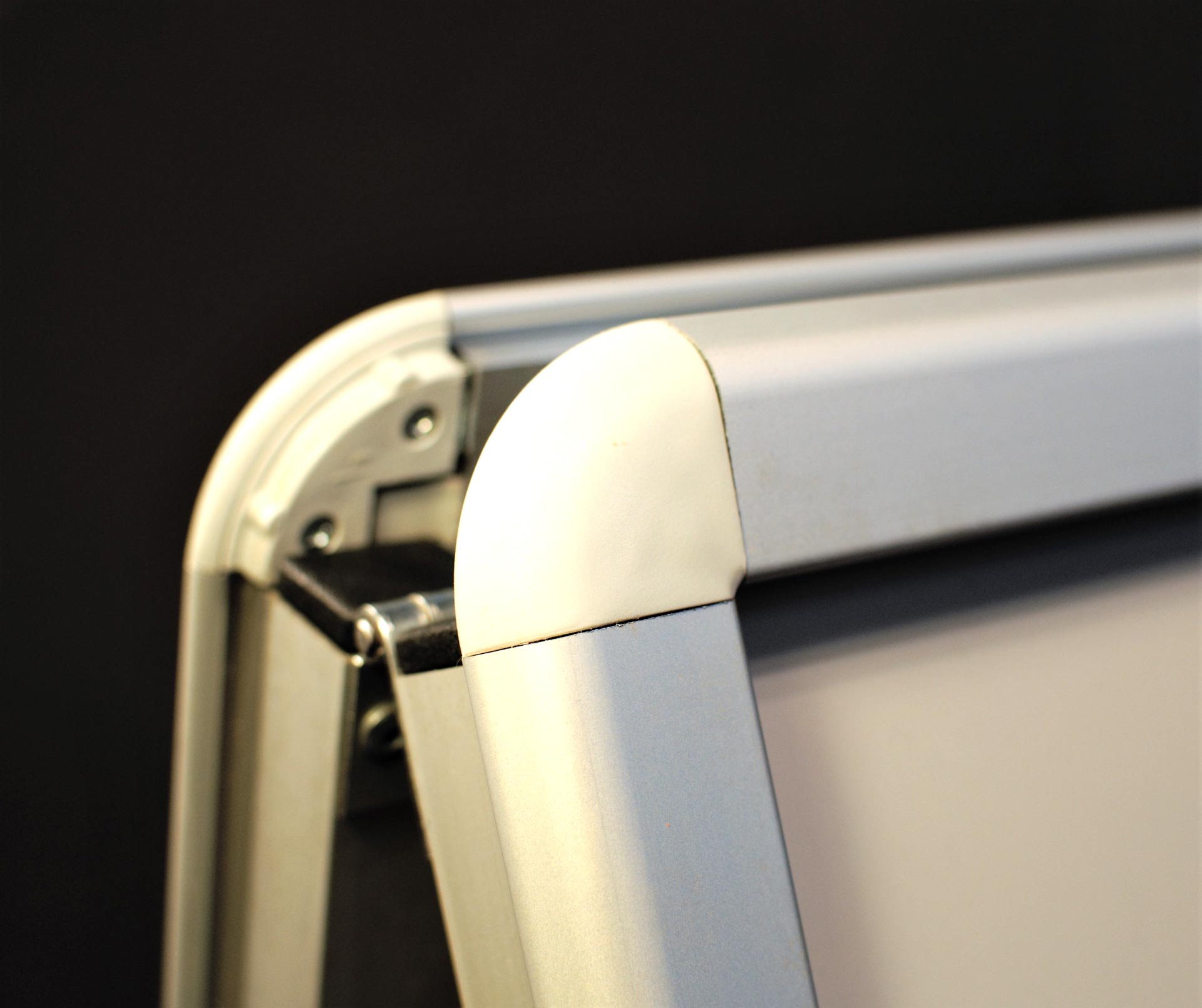 Tablice zatrzaskowe zbudowane są z profilu aluminiowego o szerokości 32mm. Profil ten jest sztywny dlatego też najlepiej nadaje się na tablice, które używamy w potykaczach. Tablica posiada folię z PCV antyrefleks, której zadaniem jest ochrona plakatu przed uszkodzeniem, zabrudzeniem, zamoczeniem, kurzem, działaniem promieni słonecznych i innymi niesprzyjającymi warunkami pogodowymi. Plecy wykonane są z mocnego i trwałego białego tworzywa sztucznego o grubości 1,5 mm. Tylny panel w tablicach można także wykonać z blachy stalowej ocynkowanej, dzięki czemu możecie Państwo użyć magnesów, które będą przytrzymywać plakat lub kilka mniejszych kartek.