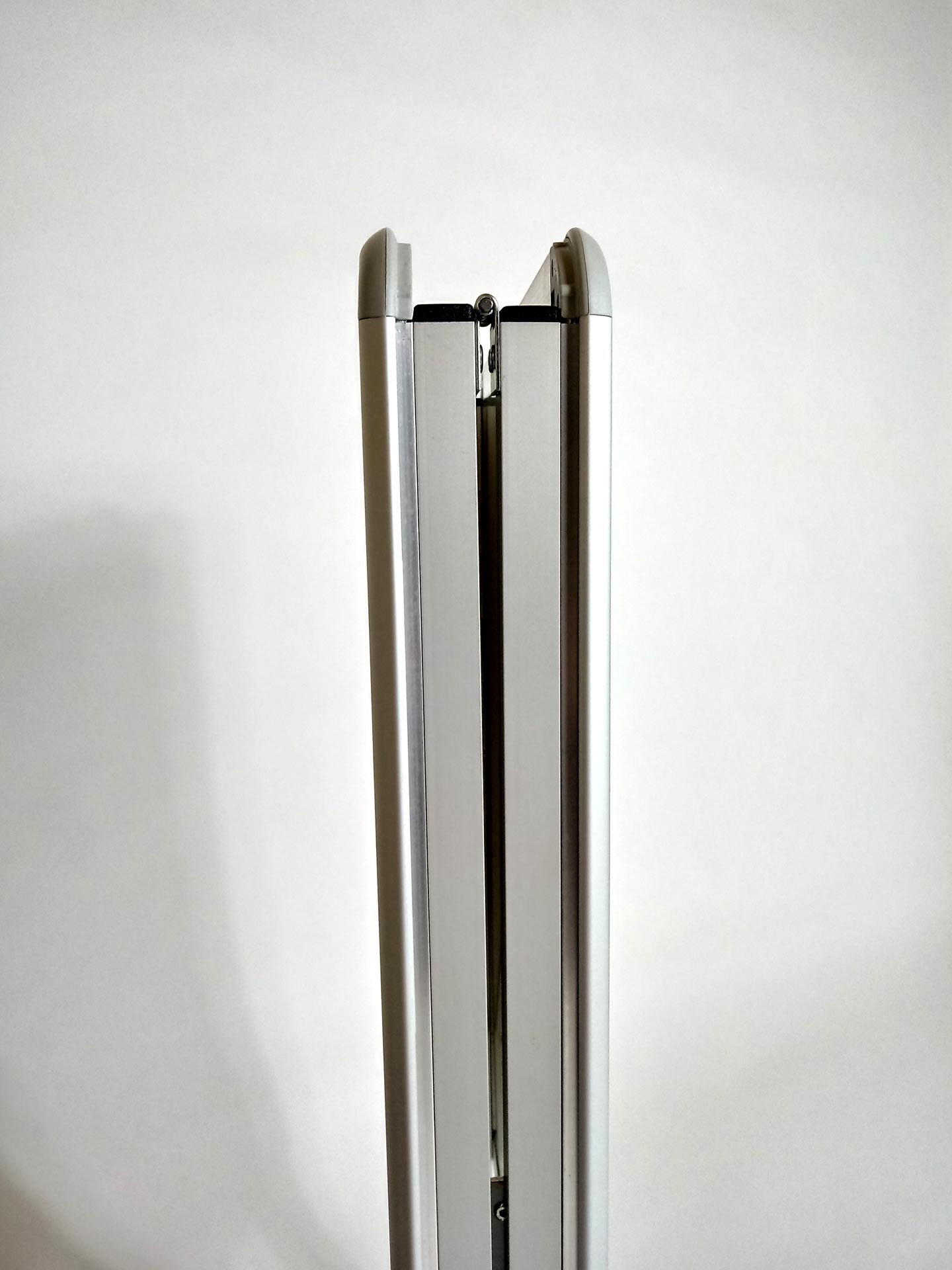 Potykacz aluminiowy dwustronny z tablicami przymykowymi to nasz standardowy, najchętniej nabywany stojak reklamowy. Wykonany jest w całości z profili aluminiowych, anodowanych w kolorze srebrnym mat. Co istotne, inaczej niż w większości dostępnych na rynku potykaczy, anodowane są także jego nogi. Anodowanie, inaczej – eloksalacja, oprócz widocznych walorów estetycznych, zwiększa wytrzymałość, odporność na uszkodzenia i korozję, a także chroni przed niekorzystnymi warunkami atmosferycznymi.