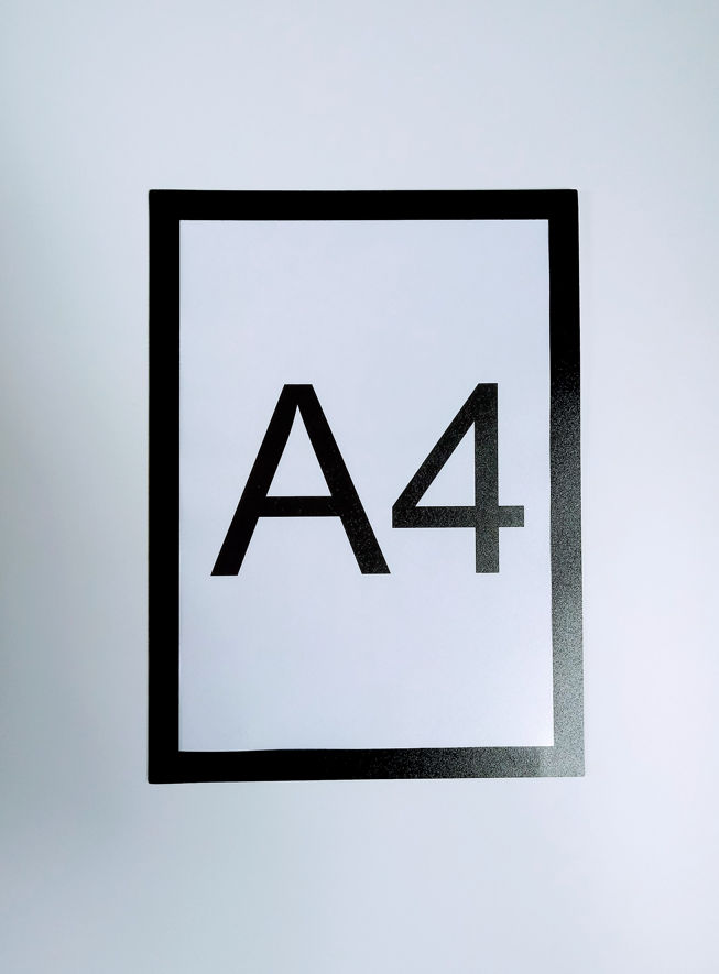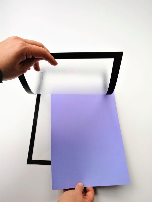 Po umieszczeniu ramki w odpowiednik miejscu, należy umieścić kartkę pomiędzy dwiema foliami antyrefleksyjnymi. Folie po bokach mają czarne paski magnetyczne.