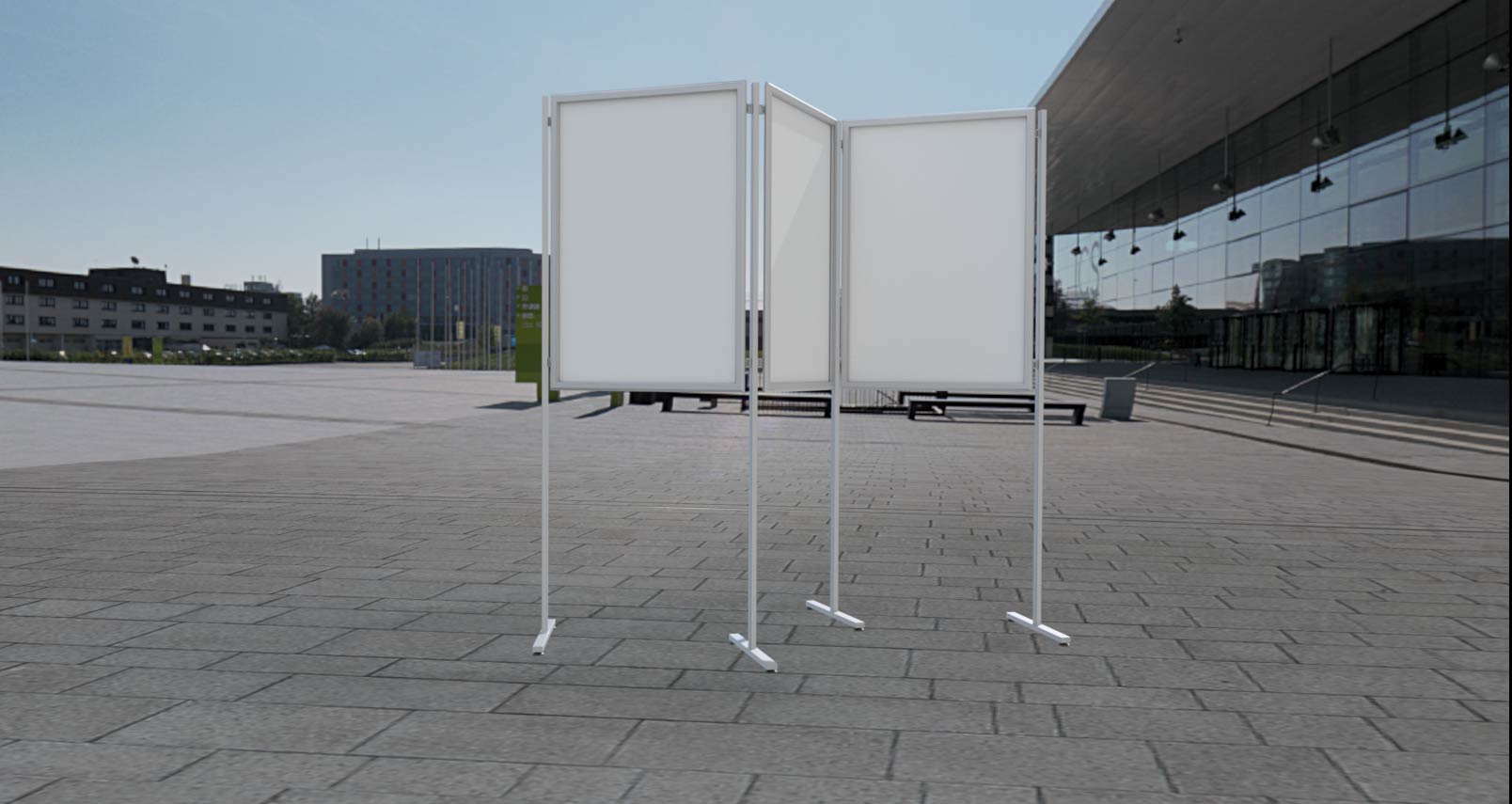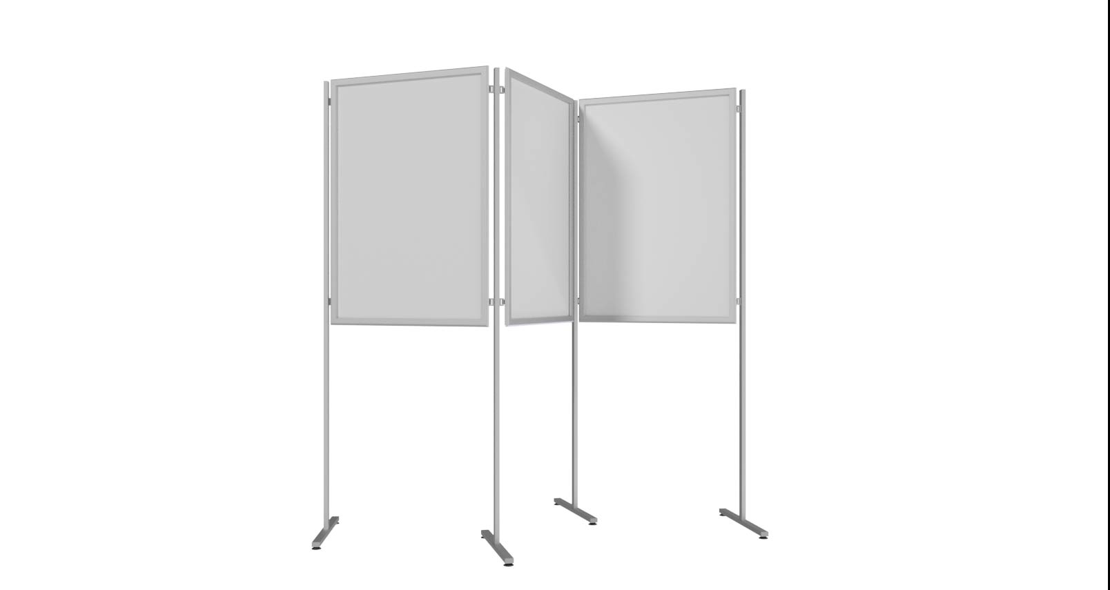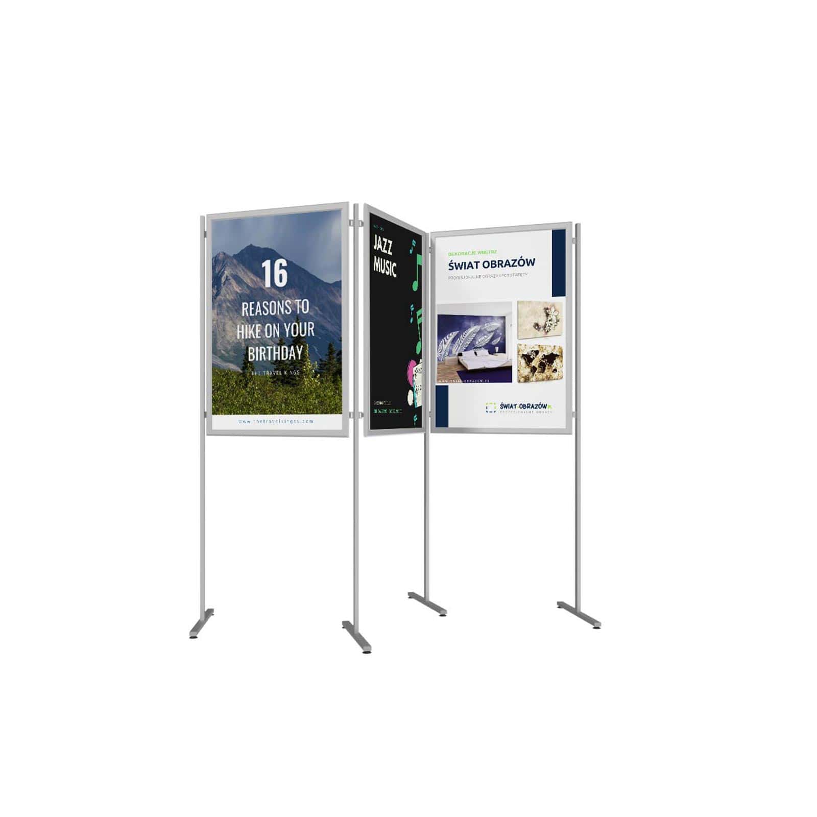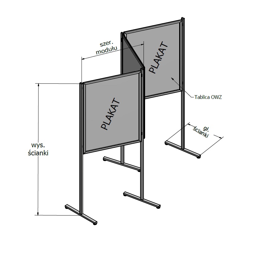 Ścianka wystawiennicza na plakaty wykonana jest z profili aluminiowych, anodowanych na kolor srebrny mat. Jej podstawę stanowią panele (moduły) na nogach wykorzystujące tablice OWZ. Ilość paneli wynosi od trzech do czterech, ale na życzenie możemy wycenić ściankę zbudowaną z kilku modułów, tym samym umożliwiając jej rozbudowę.