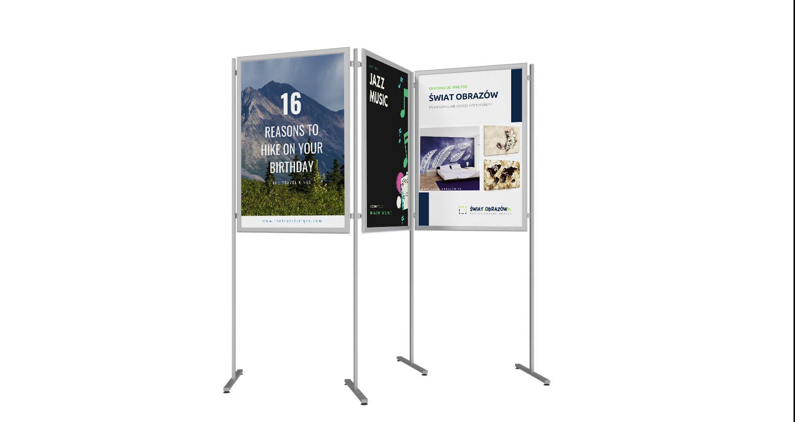 Ścianki wystawiennicze to dobre rozwiązanie w sytuacji, gdy musimy zaprezentować większą ilość plakatów i innych materiałów, i potrzebujemy większej ilości ekspozytorów. Standardowe formaty to A1, A0, B2, B1 i B0. Wymiary te dotyczą wielkości wkładu jaki zmieści się w tablicy zatrzaskowej.