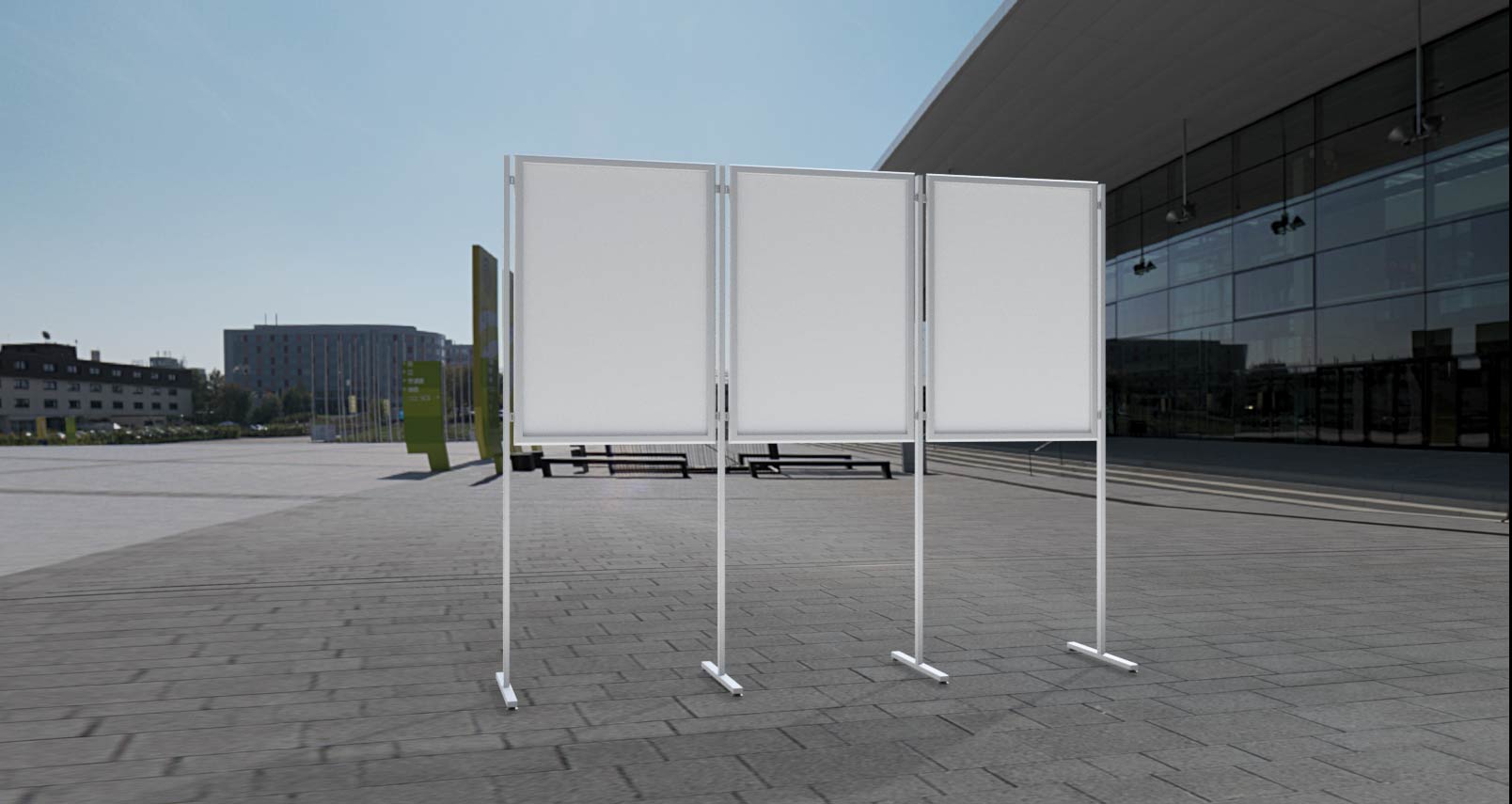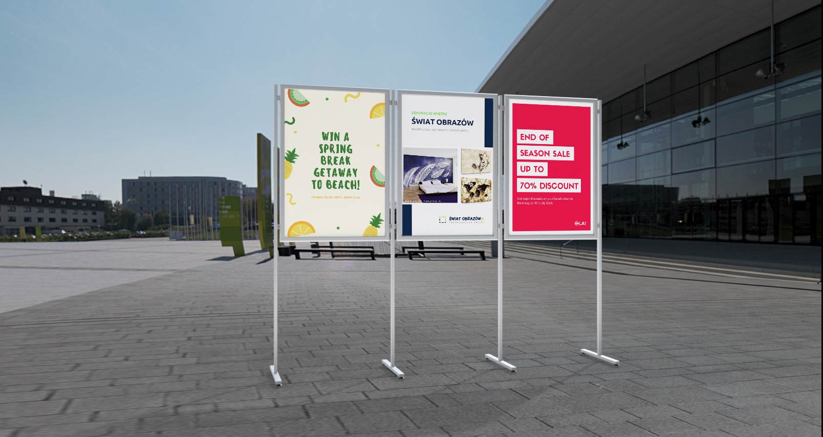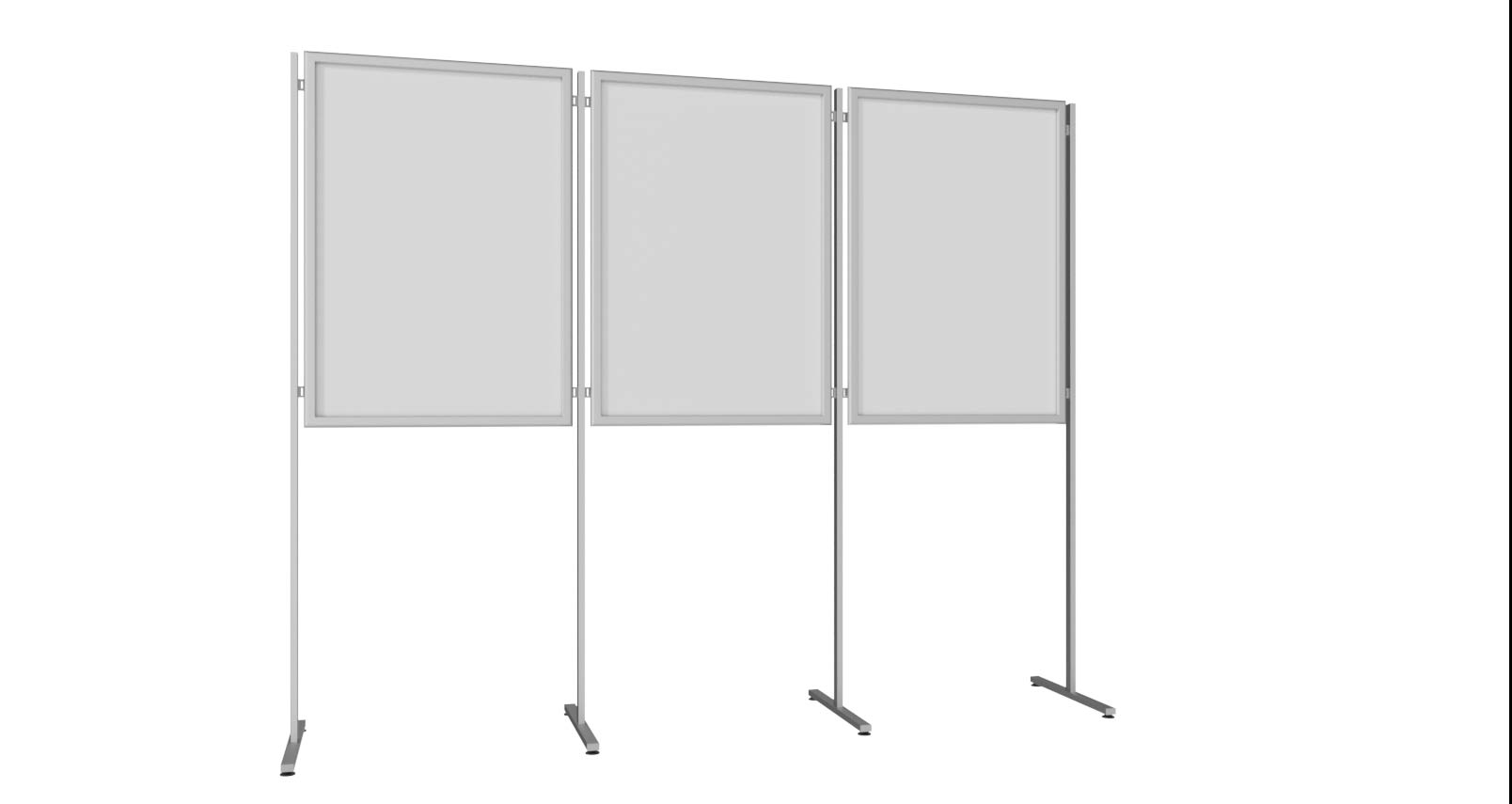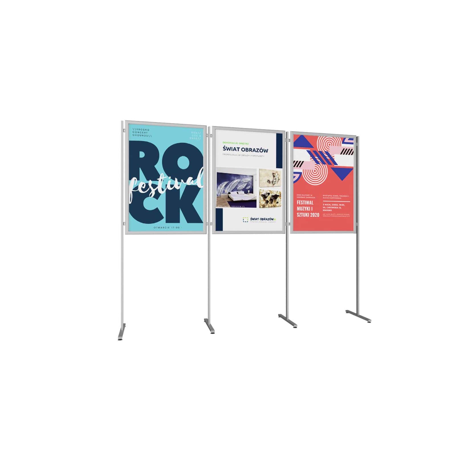Panele połączone są ze sobą na sztywno, w jednej linii. Ścianki plakatowe to dobre rozwiązanie w sytuacji, gdy musimy zaprezentować większą ilość plakatów i potrzebujemy do tego więcej powierzchni ekspozycyjnej. Standardowe formaty to A1, A0, B2, B1 i B0. Wymiary te dotyczą wielkości wkładu jaki zmieści się w tablicy zatrzaskowej.