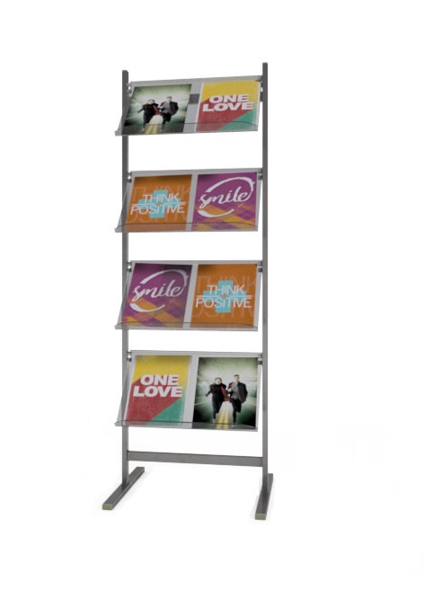 Stojak na foldery i katalogi A4, to połączenie aluminium i plexi. Półki wykonane są z bezbarwnej plexi. W zależności od wersji stojak wyposażony jest w trzy lub cztery półki.