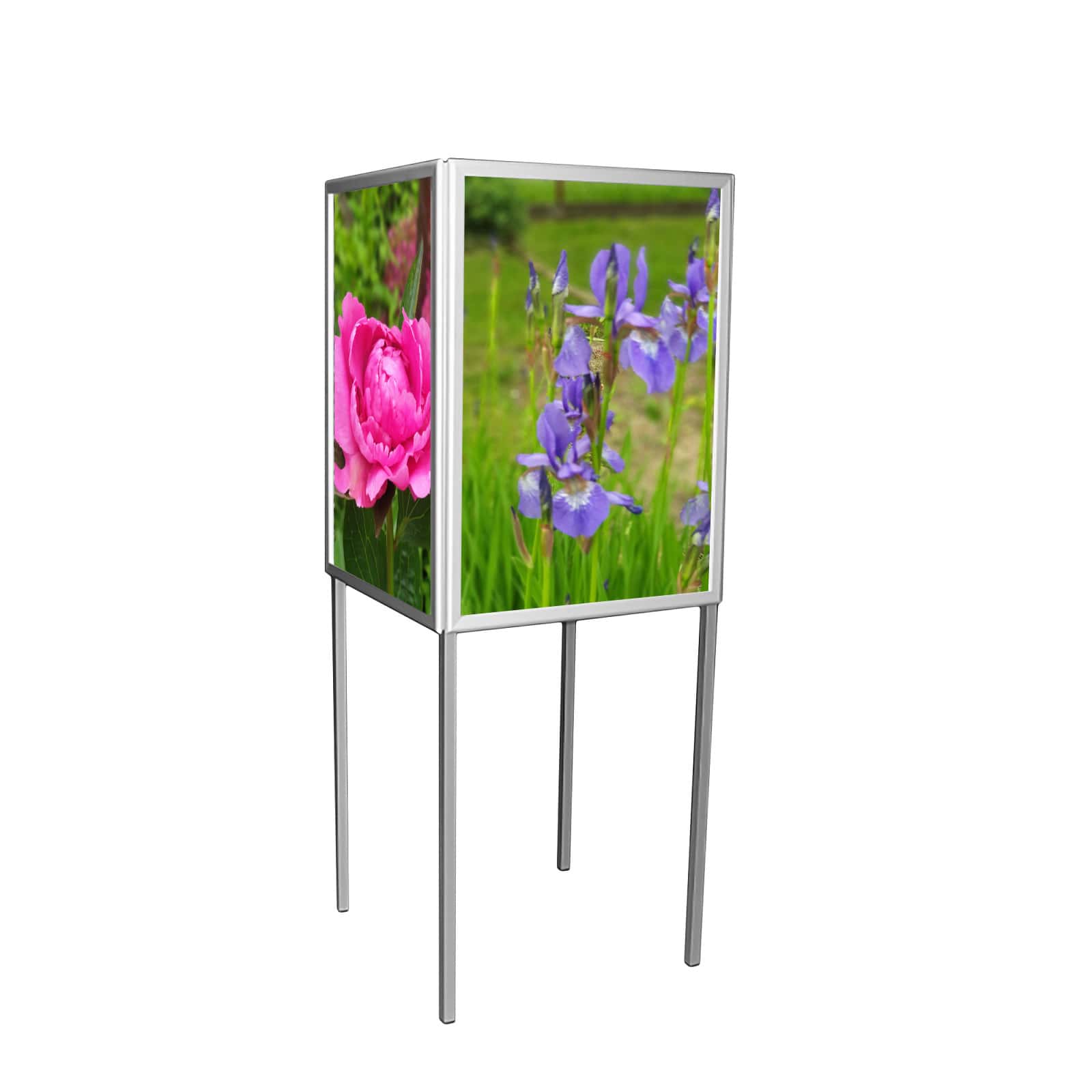 Stojak wystawienniczy na plakaty składający się z czterech tablic zatrzaskowych. Tablice zamocowano plecami do siebie (w cztery strony), dzięki czemu można ciekawie skomponować wystawę, ustawiając tematycznie kilka stojaków obok siebie. Oprócz plakatów, stojak umożliwia ekspozycję fotografii, prac plastycznych w mniejszym lub większym formacie. Z pewnością kształt tego stojaka jest bardzo interesujący, dlatego też jest to ciekawa propozycja dla wszystkich osób organizujących wystawę.