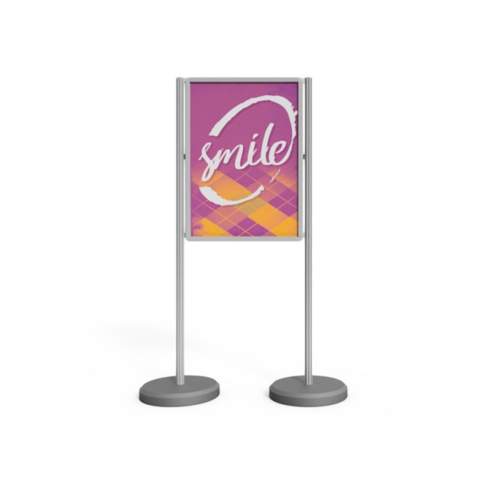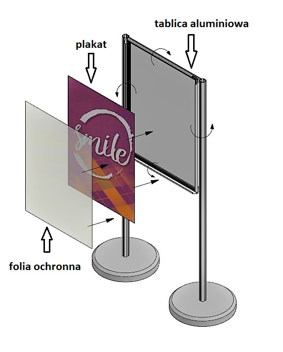 Stojak wystawowy z tablicą zatrzaskową, to produkt przeznaczony do ekspozycji plakatów na zewnątrz, w plenerze. Konstrukcja stojaka jest wytrzymała. Składa się z dwóch ciężkich podstaw betonowych, dwóch nóg z profilu aluminiowego oraz – w zależności od wersji – jednej lub dwóch tablic.