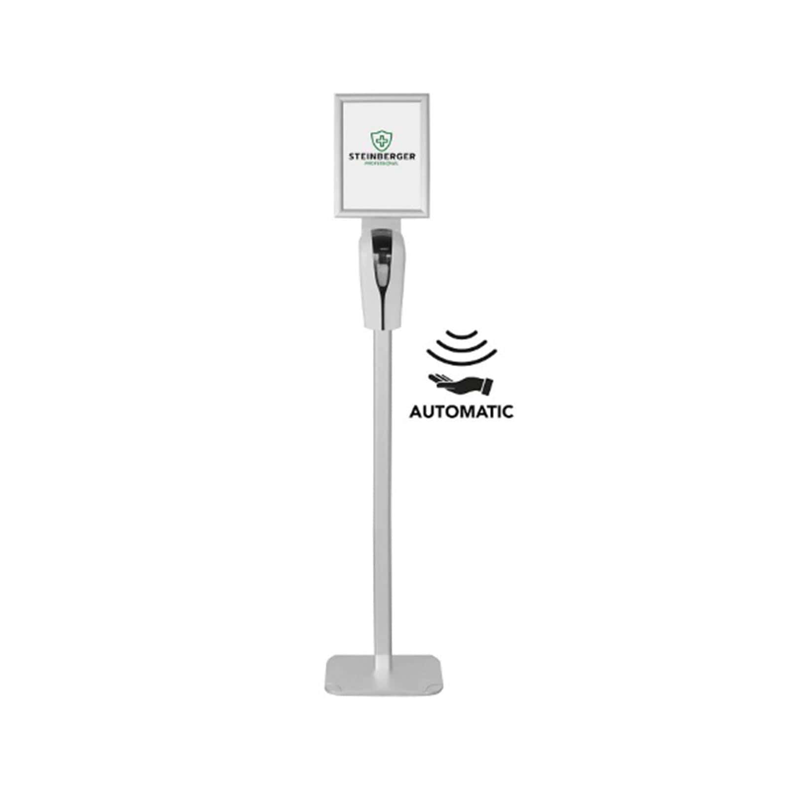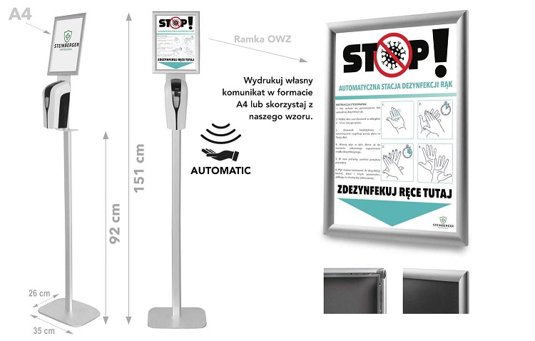 W zestawie znajdują się: automatyczny dozownik do płynów dezynfekcyjnych, stojak do dozownika w kolorze srebrnym z ramką OWZ w formacie A4. Baterie nie są dołączone.
