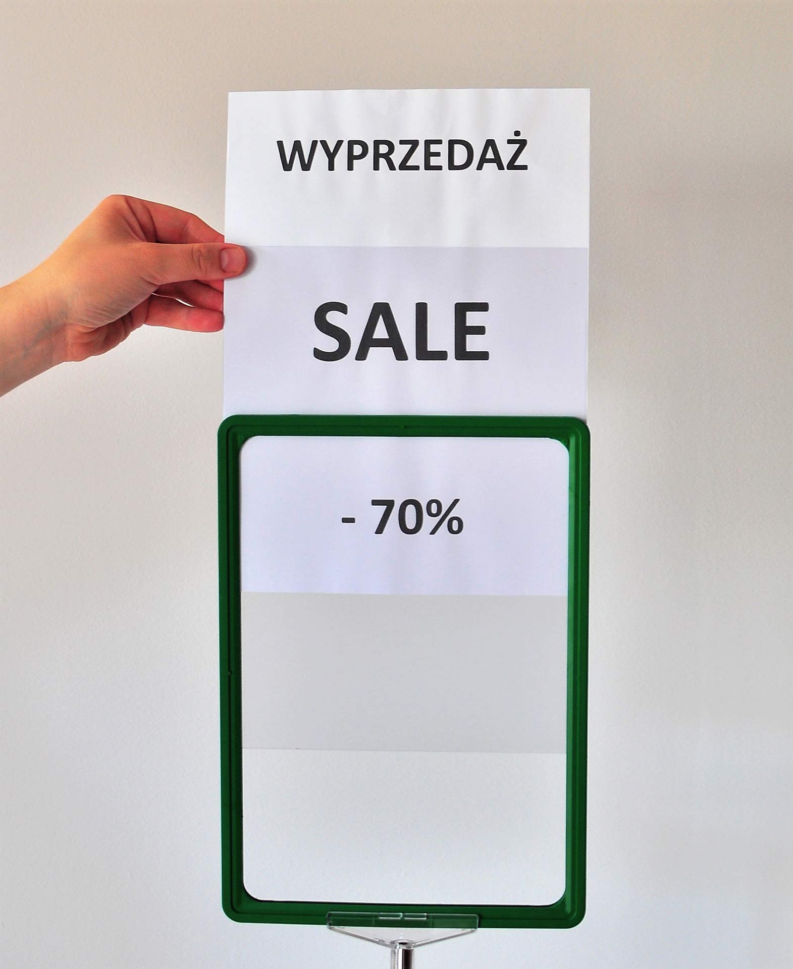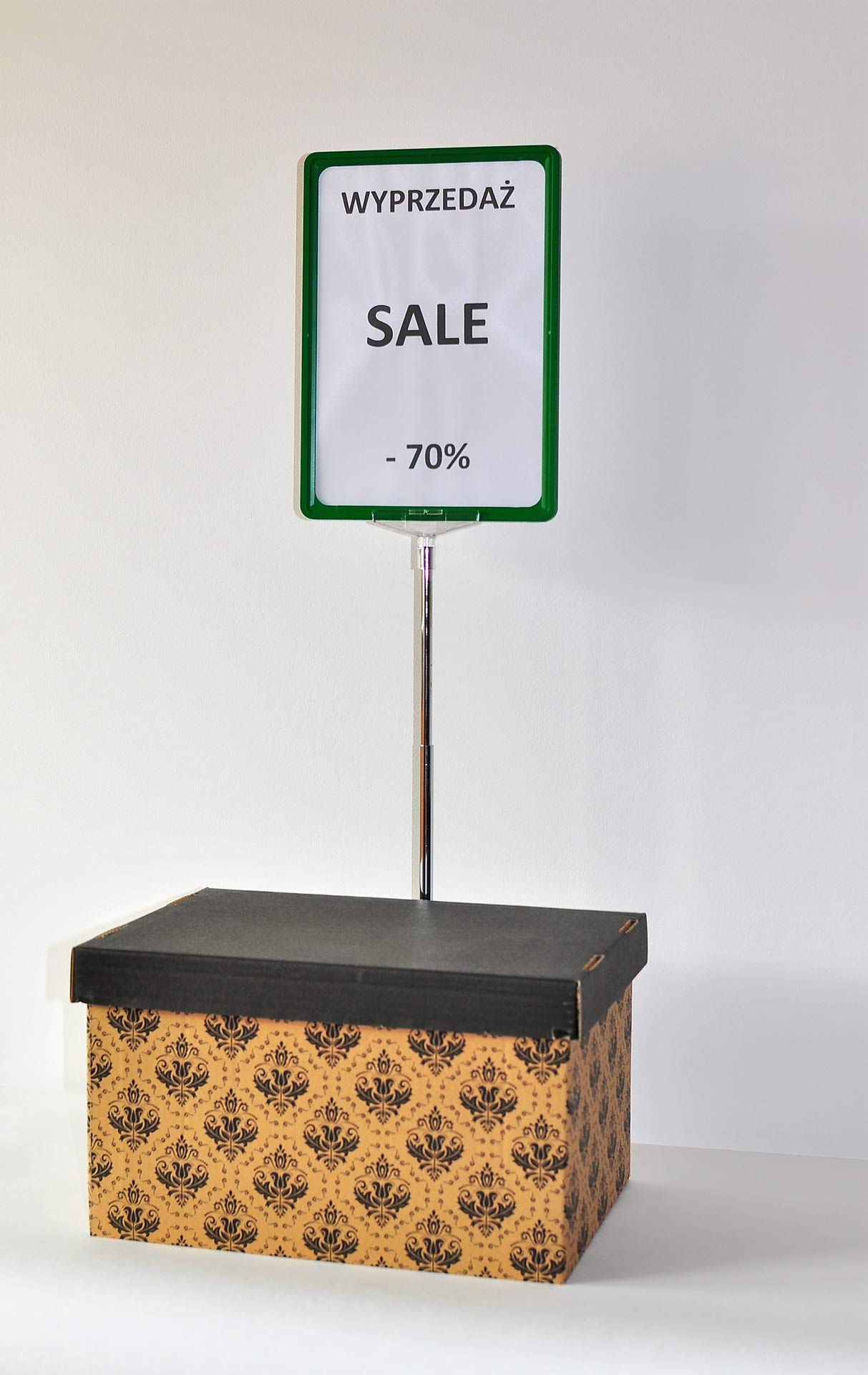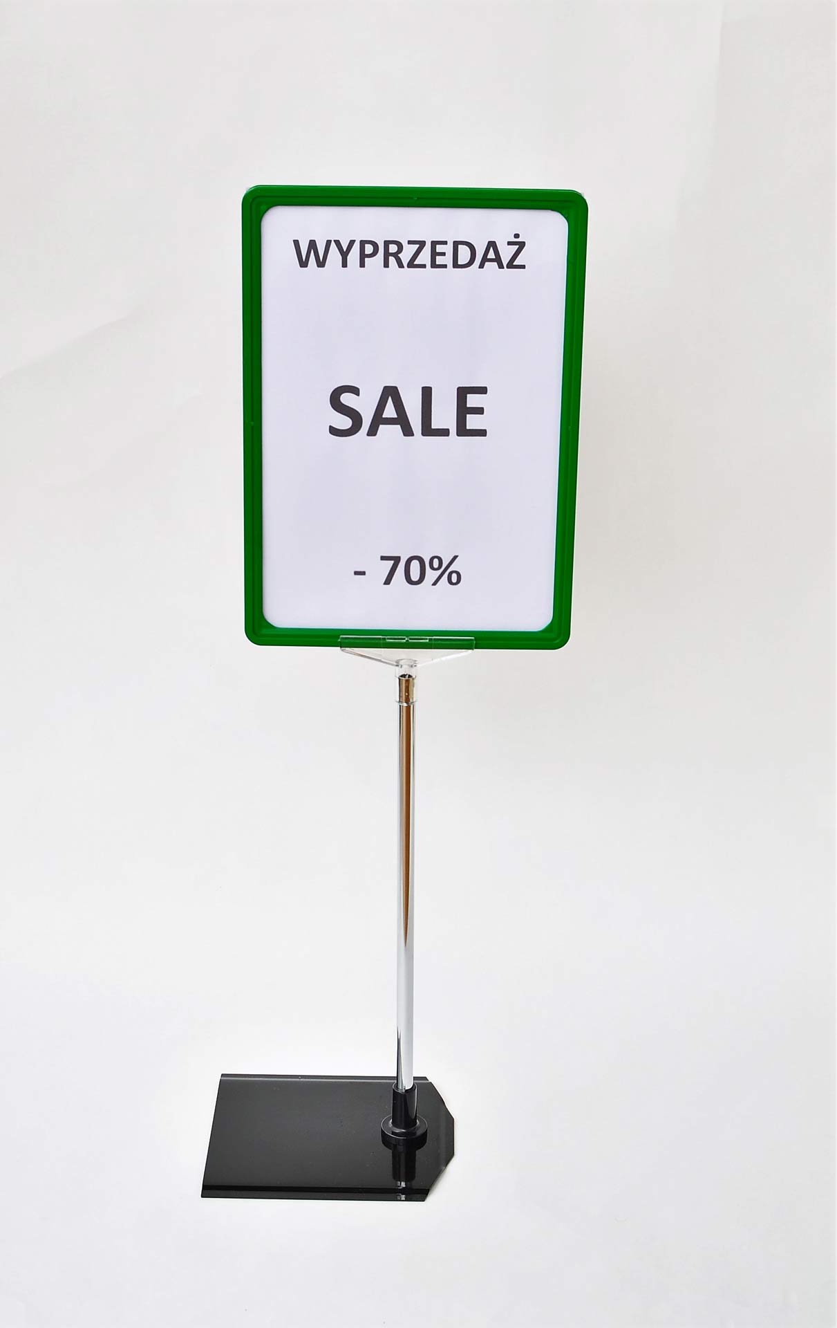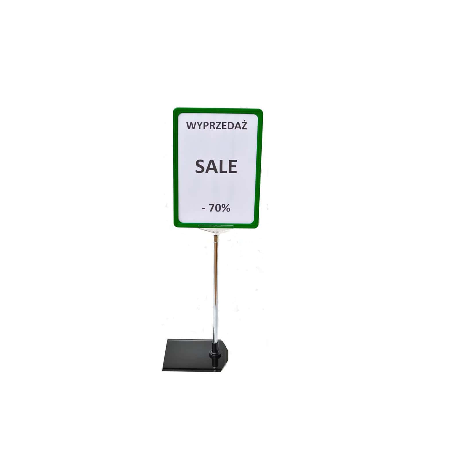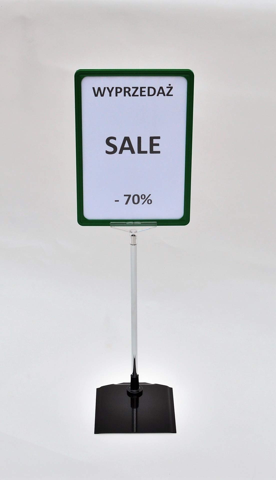 Stojak z ramką plastikową A4 na nodze teleskopowej to najpopularniejszy wybór naszych klientów, ponieważ format kartki A4 jest najczęściej używany, a naszą informację możemy wydrukować samodzielnie. Stojaczek taki często wykorzystuje się w dużych sklepach. Dzięki regulowanej wysokości, możemy go idealnie dopasować w dane miejsce, w którym będzie najbardziej widoczny.