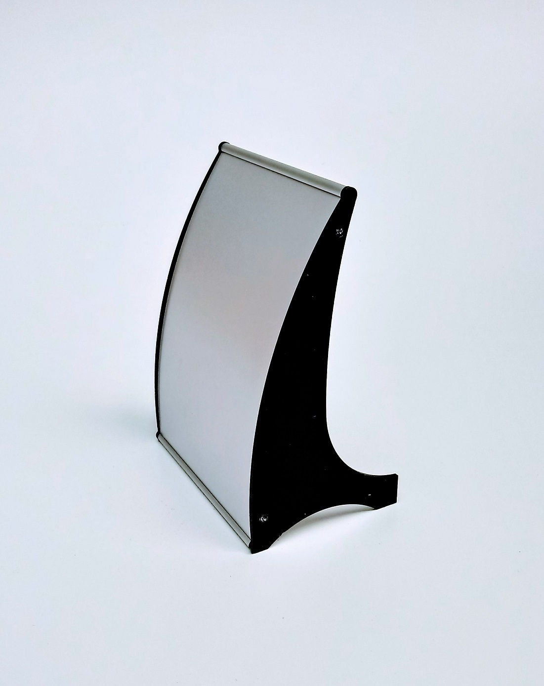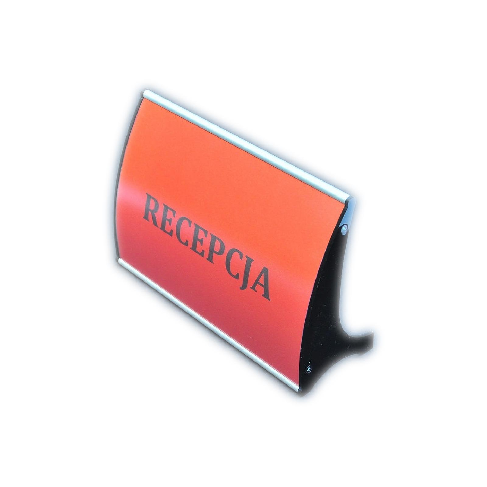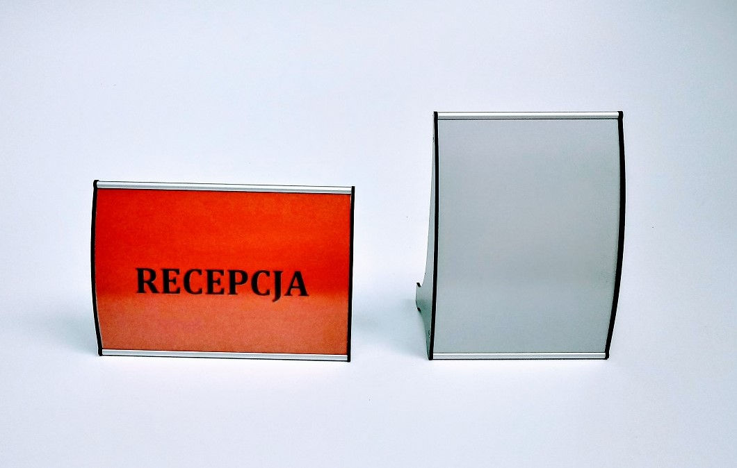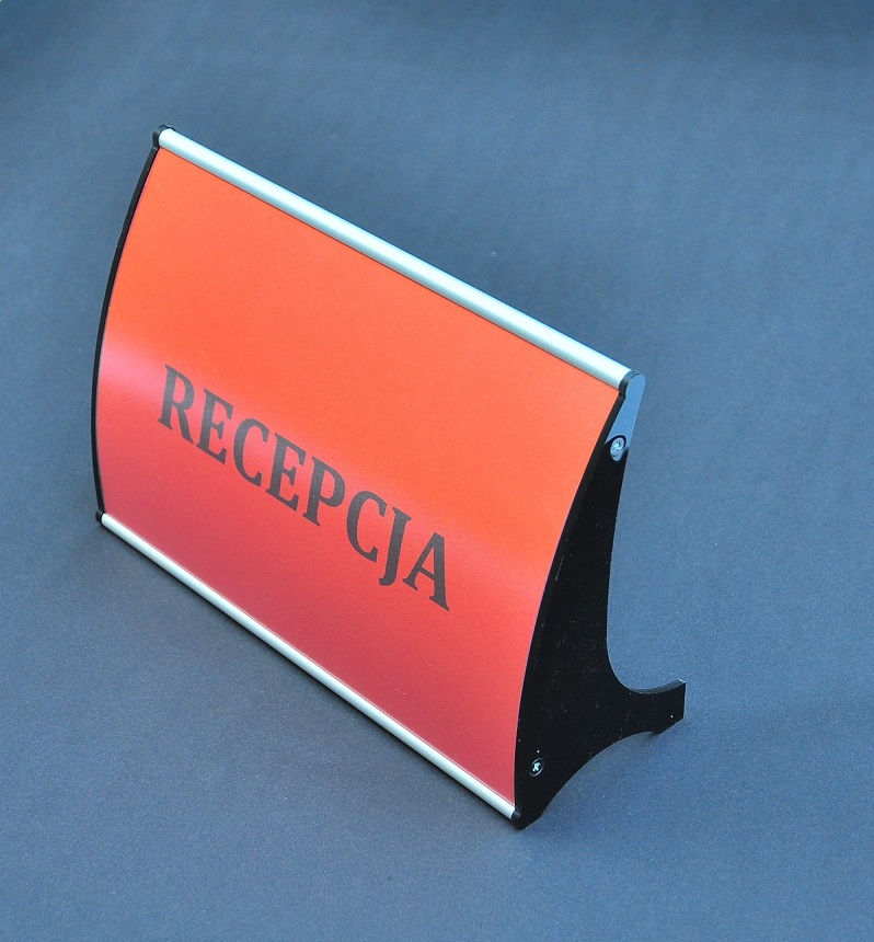 Tabliczka informacyjna na biurko ma wypukły kształt. Wykonana jest z aluminium, natomiast boczne nóżki wyprodukowane są z czarnej plexi.