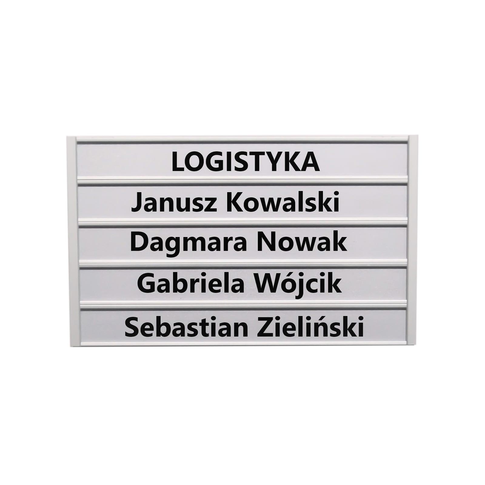 Jest to tabliczka przydrzwiowa, w której wymieniamy samodzielnie treść. Przygotowane przez nas wydruki z informacją oraz folię ochronną wsuwamy w prowadnice profilu aluminiowego. Operacja ta jest szybka i łatwa. Tak przygotowany moduł wsuwamy od góry w tzw. część bazową i dociskamy małą śrubą imbusową, która znajduję się z boku.