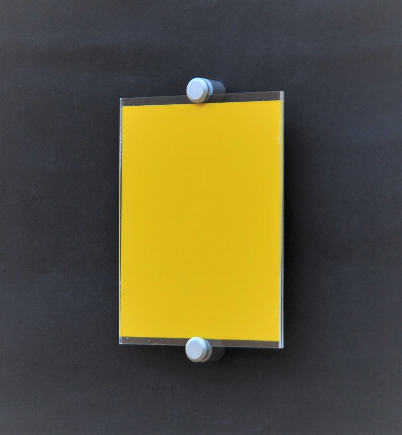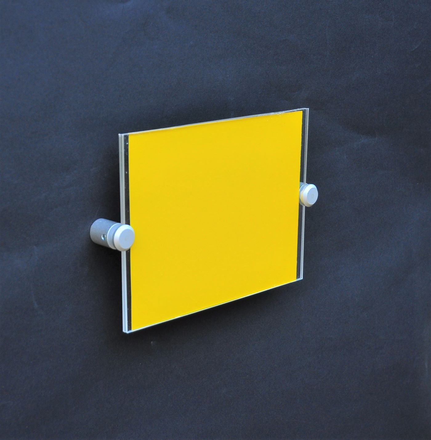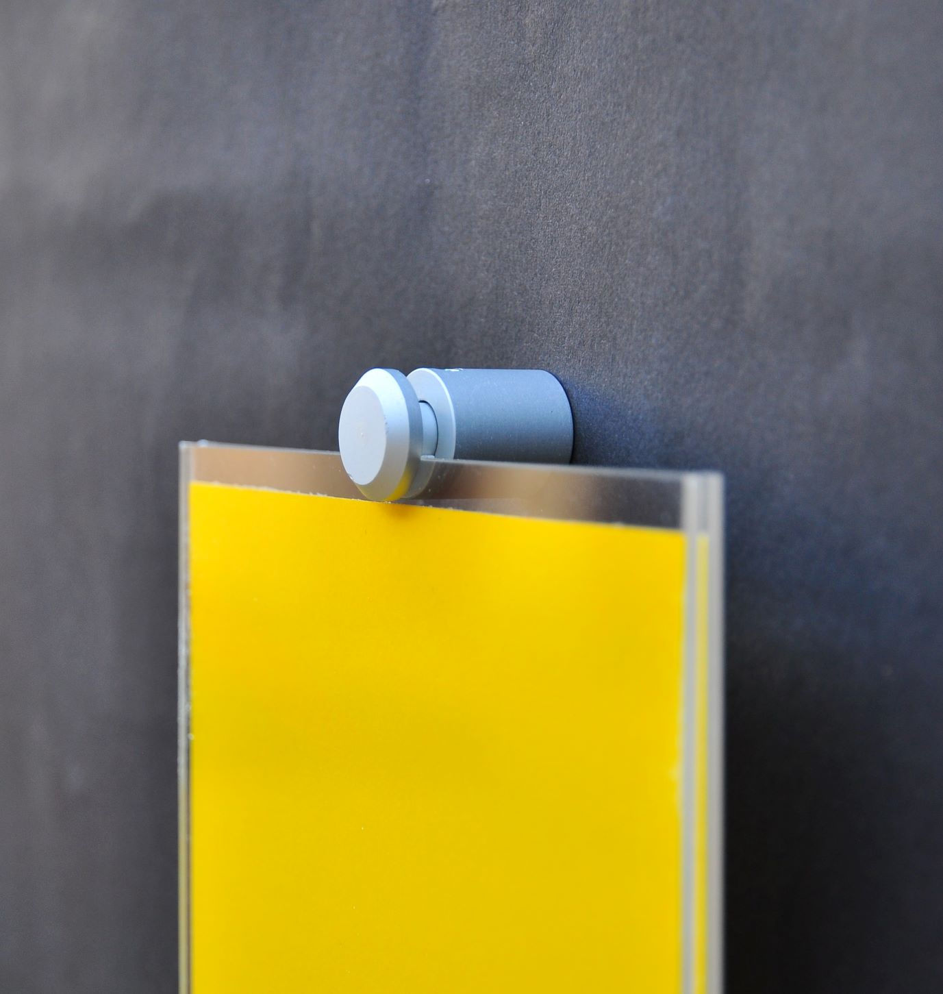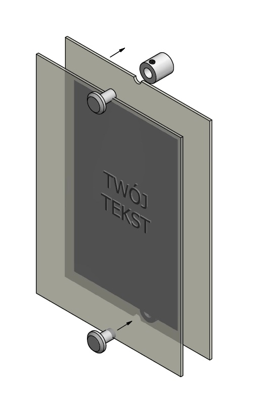 Tabliczka przydrzwiowa zakładkowa składa się z dwóch formatek z plexi bezbarwnej o grubości 2mm. Możesz mocować ją do ściany lub drzwi za pomocą srebrnych kołków dystansowych. Kartkę umieszczamy między dwoma płytkami z plexi. Kołki przytrzymują tabliczki na ich krawędziach, w których znajdują się specjalne, małe wycięcia.